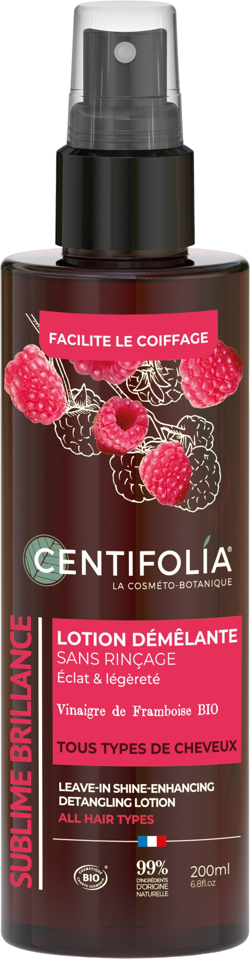 Questa lozione lucidante e districante senza risciacquo, adatta a tutti i tipi di capelli, dona lucentezza e facilita la pettinabilità. La sua formula con aceto di lampone biologico e acido lattico chiude la cuticola del capello, levigando la fibra capillare senza appesantirla o ungerla.