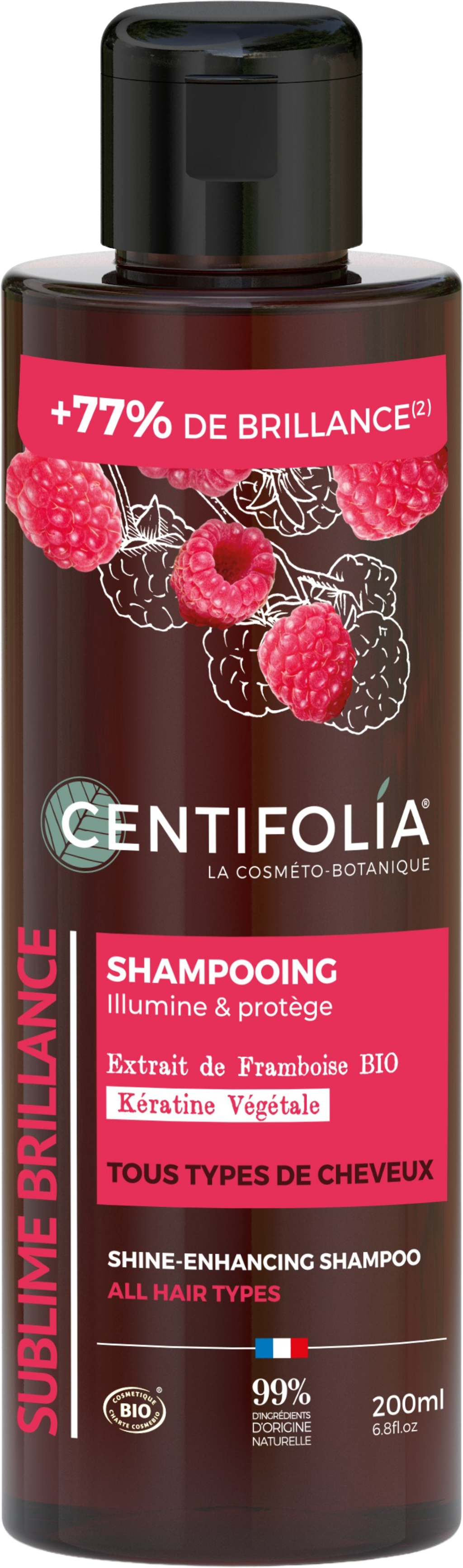 Questo shampoo illuminante, adatto a tutti i tipi di capelli, deterge delicatamente e a fondo i capelli grazie alla sua formula ultra delicata e senza solfati. Ingredienti attivi selezionati, come l'estratto di lampone biologico e la cheratina vegetale, donano proprietà protettive, lucentezza e leggerezza. I capelli risultano anche più facili da pettinare dopo il trattamento.