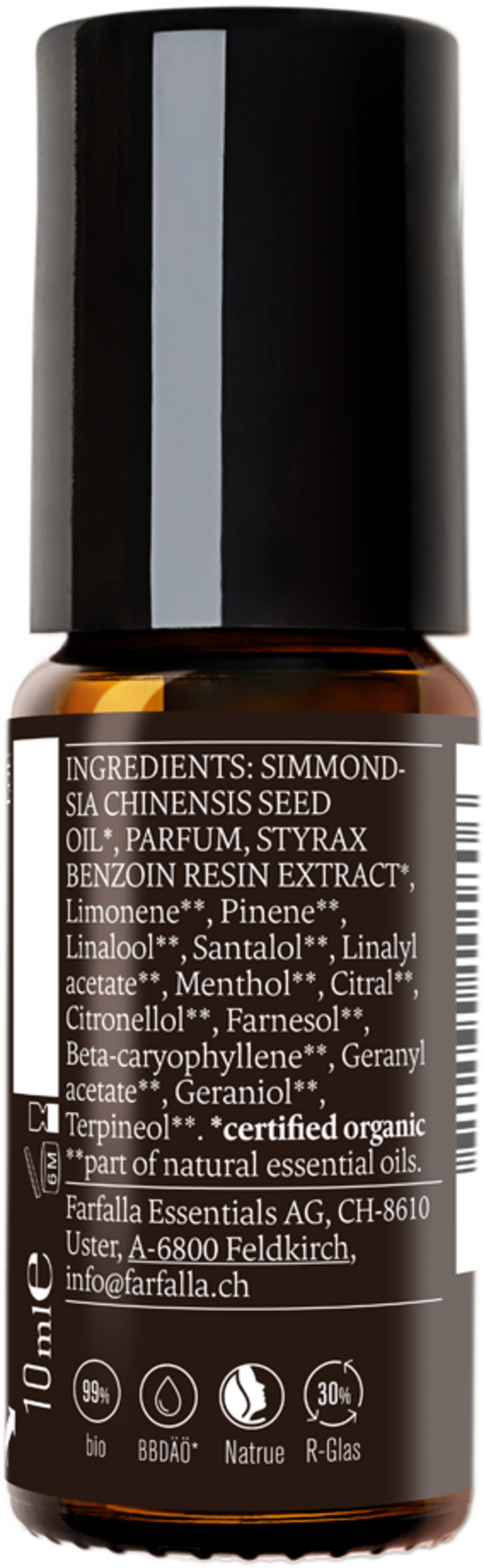 Simmondsia Chinensis (Jojoba) Seed Oil[1], Parfum, Styrax Benzoin Resin Extract[1], Limonene[2], Pinene[2], Linalool[2], Santalol[2], Linalyl Acetate[2], Menthol[2], Citral[2], Citronellol[2], Farnesol[2], Beta-Caryophyllene[2], Geranyl Acetate[2], Geraniol[2], Terpineol[2]