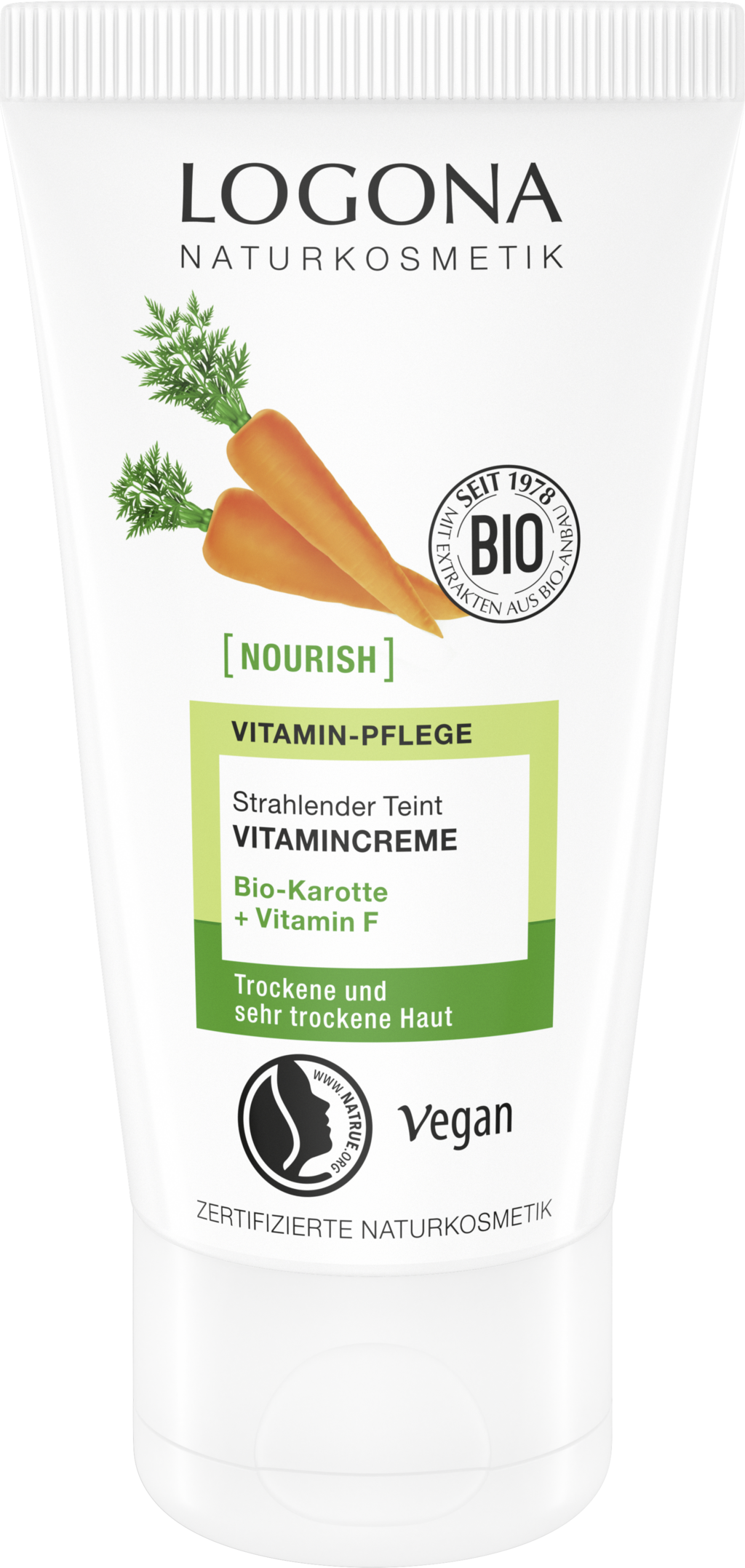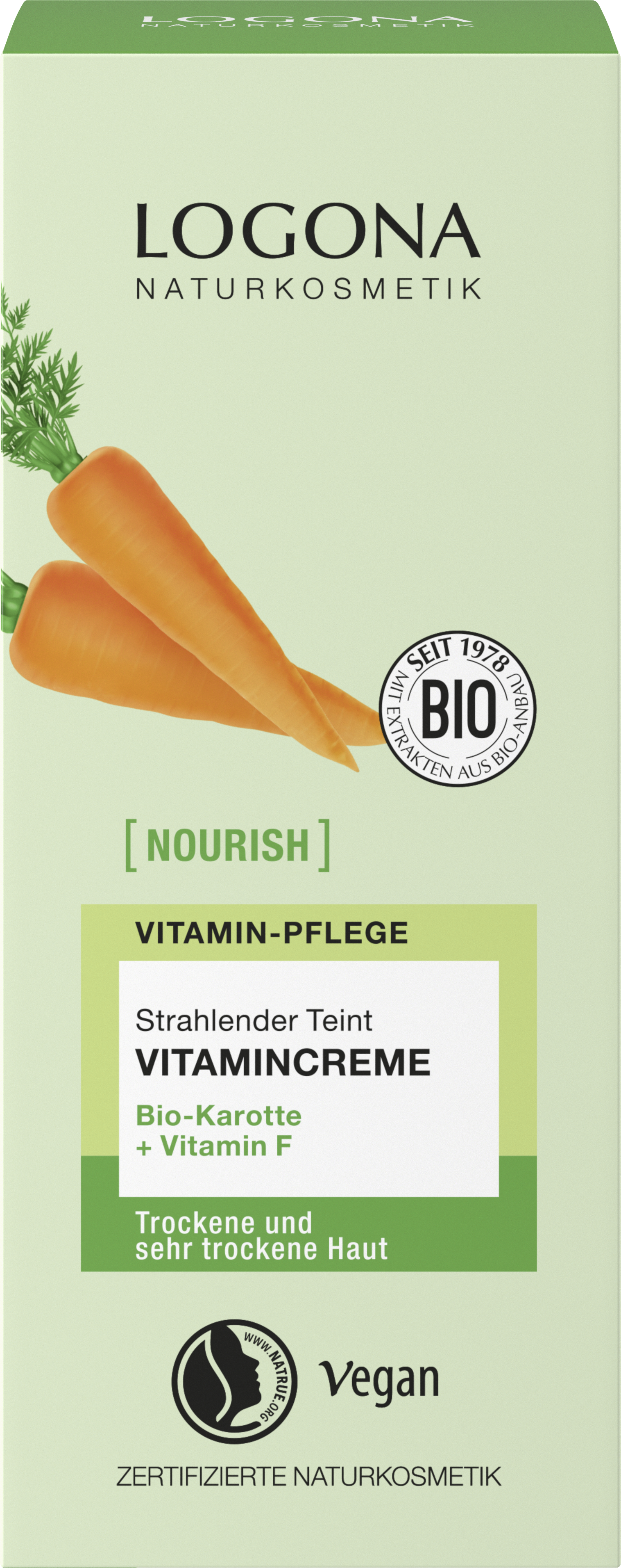 Questa crema vitaminica non solo fornisce un'idratazione intensa per un incarnato uniforme, ma offre anche un effetto leggermente colorato. La formula delicata con carota biologica e vitamina F protegge anche dai radicali liberi e riduce visibilmente linee sottili e rughe.