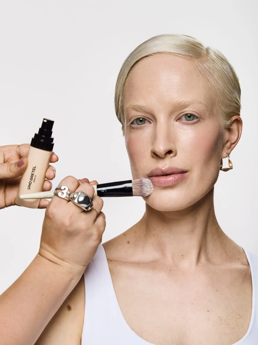 - Applicazione del fondotinta: agitare bene EBEN Liquid Foundation. Applicare 1–2 erogazioni sul dorso della mano e sfumare dal centro del viso verso l’esterno con le dita o con un pennello da fondotinta. Utilizzare una spugnetta oppure applicare con le mani.